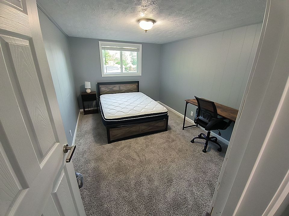 Full size bed frame, mattress, nightstand, lamp, desk and office chair provided. BYO bedding.
