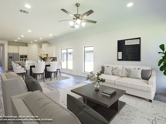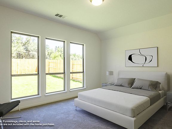 Extended entry with 12-foot ceiling leads to open kitchen, dining area and family room with 10-foot ceilings throughout. Kitchen features corner walk-in pantry, 5-burner gas cooktop and generous island with built-in seating space. Family room features wall of windows. Primary suite with 10-foot ceiling and wall of windows. Dual vanities, garden tub, separate glass-enclosed shower and large walk-in closet in primary bath. A Hollywood bathroom connects to bedrooms three and four. All bedrooms feature walk-in closets. Covered backyard patio. Mud room off two-car garage. Representative Images. Features and specifications may vary by community.
