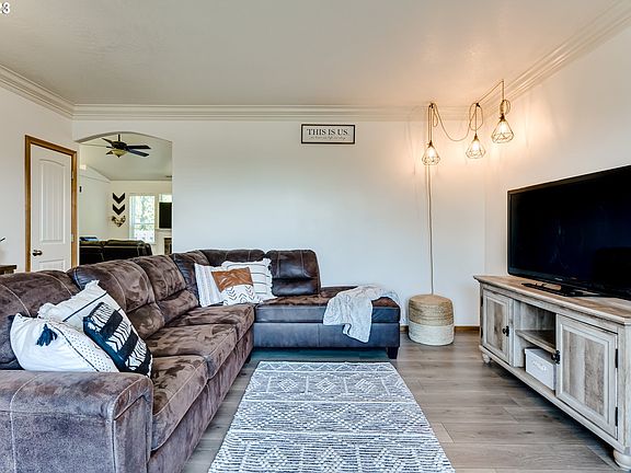 Darling single level home with high ceilings and spacious RV parking. Inviting formal living room with crown moulding and natural light. Open concept kitchen, dining and family room. Vaulted ceilings, additional lighting and island with eat bar create a great space for entertaining. Primary bedroom has crown moulding, walk in closet, and en suite with double sinks and walk in shower. Large bedrooms with high ceilings give an open feel to the space. Indoor laundry with built in shelving. Sliding doors bring you to a private patio in the backyard. Fully concreted RV parking behind the gate. Underground sprinklers in both front and back yards.