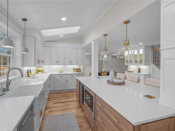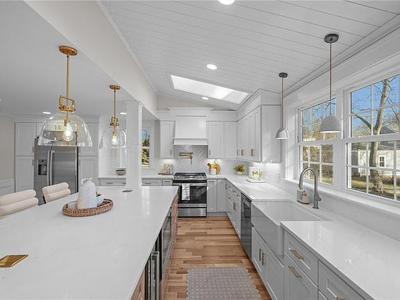 A beautiful, completely remodeled Barrington beauty awaits! Just 2 preexisting walls remain in this custom reinvention. Careful planning and impeccable craftsmanship unite to create this stunning, expansive home featuring three floors of finished living space on a serene, expansive lot. Enter via your coveted front porch to an open concept view boasting a stylish kitchen with hickory oak hardwoods, a 9-ft island, skylights, two pantries, & a custom hood. Extend the entertaining seamlessly outdoors on your Trex deck and thrive with the high functionality of an oversized garage & mudroom. Dine in a sunlit space with a focal chandelier, and relax in your light-filled living room with a sleek electric fireplace. A coveted first-floor bedroom/ office with a stylish tiled en suite awaits. Upstairs, find two large bedrooms, a full bath, laundry room, and a glorious primary suite with a cathedral ceiling, 2 walk in closets, balcony and an en- suite with a double quartz vanity, clawfoot tub, and tiled, rain-head shower. The lower level offers a media room, storage, and walkout to a lighted hardscape overlooking the wooded yard. With superior craftsmanship, millwork, and finishes—including refined lighting, shiplap, and stylish gold hardware—this home exudes luxury at every turn. Enjoy underground utilities, & central air, in Barrington’s sought-after Alfred Drown neighborhood. A home checking all the "new home" desired features awaits in one stylish, luxuriously curated fashion!