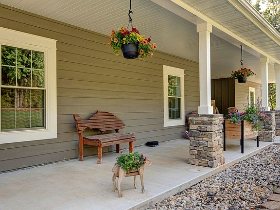 This home is completely unique - it features classic American architecture, state of the art eco features and a gorgeous rustic setting! Settled on 10 acres with lawn, woods (with ATV trails!) and a wet weather creek, the home offers 4 bedrooms, 3 baths in 2430 square feet of living space. Home does NOT require flood insurance. The 3 car attached garage adds an additional 863 square feet and includes an EV charging station, sink and epoxy floors for easy cleaning. The home was built using ICF construction, or Insulated Concrete Forms, offering benefits such as improved safety against extreme weather and fires, quieter interiors, lower energy costs, and increased durability compared to traditional wood-framed homes. Exterior is finished with James Hardie plank siding. Its is ultra durable and non combustible with an A class a fire rating. Inside, air quality is a priority with a heat recovery ventilator and you can enjoy the woodburning fireplace without the smoke and soot! It is an EPA Certified Catalytic Stove which features improved safety and efficiency--it produces almost no smoke, minimal ash, and requires less firewood. You will love the whole house radiant floor heating as an efficient, silent and dust free way to warm the home. There is also zoned forced air and central electric air conditioning. 30x40 shop with 220 and RV jack and indoor RV parking.
