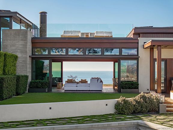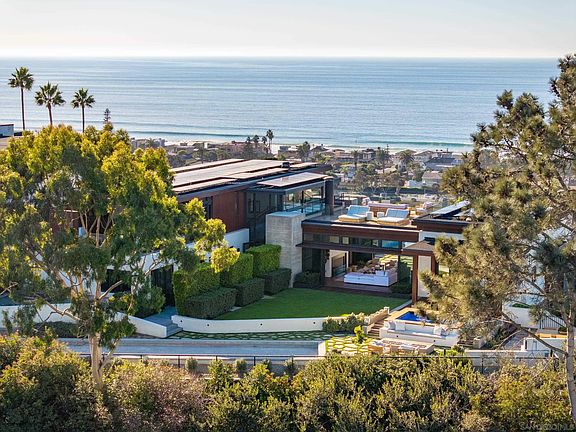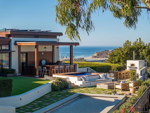 This is it: The crown jewel of Del Mar. Del Mar’s finest hillside home features truly breathtaking views and unmatched amenities. Reimagined from head to toe in 2024, with features not available in any other home in the area including the finest finishes inside and out, HEPA grade air filtration, a bocce court, pickleball court, wood burning pizza oven, multiple Tesla powers walls, and a photobeam perimeter security system. The home features 7,393 sf of living space perched on a 22,215 sf flat parcel at the highest ridge in Del Mar giving the property unmatched 360 degree views of the Pacific Ocean to the west and mountain views to the east. Simply the finest home in Del Mar. KAA Design Group out of LA had the task of designing a home that was worthy of this landmark property. They didn't disappoint with this SHOW STOPPING warm coastal modern retreat. The exterior of the home features a mix of board formed concrete, rich stained mahogany, and floor-to-ceiling glazing to take-in the white water ocean views from nearly every room in the house. The Main Residence has 5BR and 8BTH which includes a 3BR "Kid's Wing" perfect for large families. There is also a dedicated office, playroom, den, gym, and ample storage. Plus a 1BR detached Casita with kitchenette and separate entrance for visiting guests. HUGE 2,795 sf parking garage with room for 9 cars. The grounds include a vanishing edge pool, jacuzzi, sports court, bocce court, pizza oven, outdoor bar, fire pit, and covered outdoor fireplace. There will never be another home like it in Del Mar.Below is a list of some of the home's other features: - 84 LG 385 watt solar panels (32 kW system) - 6 Tesla Powerwall backup batteries - Separate climate control for all of the home's bedrooms - IQ Air HEPA grade air filtration - Lutron Homeworks system for lighting control - Lutron electric shades in all bedrooms and most common spaces - Dornbracht plumbing fixtures throughout - Whole house filtration and soft water system - Multiple ChargePoint EV chargers in the garage - Perimeter photobeam detection security system - Automatic pool cover on both pool and jacuzzi - Sports court with basketball and pickelball net - Wood fired pizza oven - Covered outdoor room with fireplace - Covered outdoor room with full bar and seating - Two large storage / mechanical rooms
