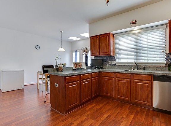 Former builder''s model brick front garage TH w/endless improvements: new windows(2008); new roof(2005); new carpeting(2014); remodeled kitchen w/updated cabinets, SS appliances(2013), granite counters, granite tile backsplash, & laminate floors; tall 9'' ceilings; multiple skylights; added extensive moldings; MBR w/vaulted ceiling & walk-in closet; finished walk-out LL w/fireplace; community pool!