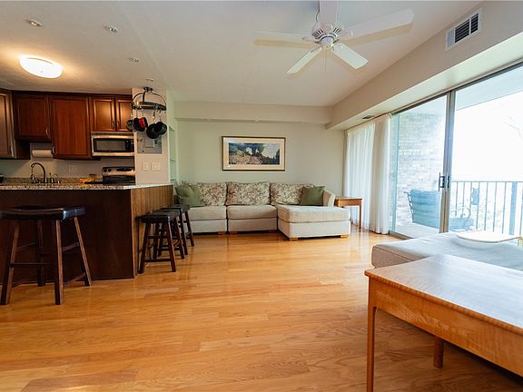 Stunning penthouse residence showcasing exceptional design & custom craftsmanship throughout. This condo features 3” oak flooring in the liv/din rooms, & both bedrooms, paired with 3” directional ceiling puck lighting—fully dimmable for a warm, inviting ambiance. Three remote-controlled ceiling fans provide comfort and style. Custom kitchen & bathrooms were designed and built w/ attention to every detail, including dovetail & soft-close drawers. Bathrooms feature 12x24” tile flooring, low-voltage heated floors, in-wall thermostat heaters, & designer finishes. The primary suite includes a walk-in shower; the 2nd bath w/ tub/shower combination. Ample built-in storage w/ illuminated closets w/ shelving, additional cabinetry in the hallway & on the private patio, plus an assigned #80 storage unit on the first floor. Maytag stacked W/D in unit, w/ additional laundry facilities available on same floor. Upgraded electrical box, switches, & outlets throughout. Fee includes Gas/H20/Sew/Trash