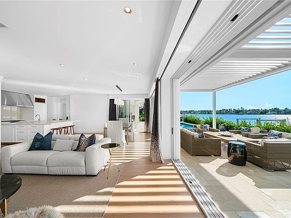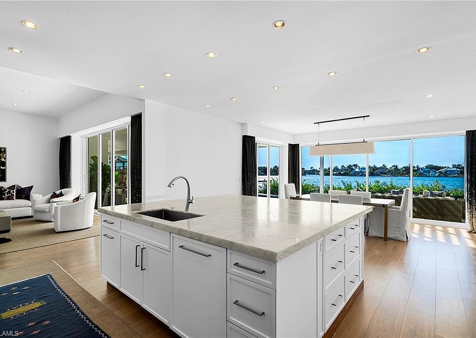 Private boat dockOpen bay waterfront lotOversized island with seatingTop-tier finishesExpansive windowsSparkling chandelierOpen floor plan