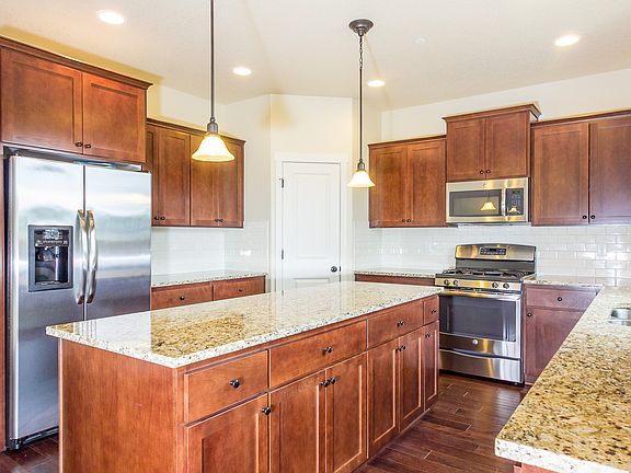 Dark hardwood flooring and 9 foot ceilings in kitchen, nook and entry. Kitchen with slab granite countertops, full tile backsplash, stainless steel appliances, pantry, pendant lighting and more.
