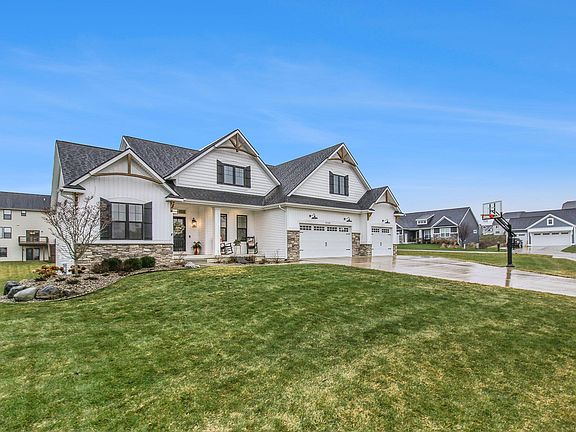 Beautiful Planters Row 6 BR/3.5 BA custom build contemporary farmhouse within walking distance of Byron Center Schools. Built in 2018; meticulously cared for home has open concept with enlarged dining, bright and functional kitchen of quartz countertops, barn beams, pantry, stainless appliances and over-sized island. Living room has custom mantel, gas log fireplace and tons of natural light. Main floor bedroom has vaulted ceilings, walk in closet, ensuite bathroom with double sinks, floor to ceiling walk-in tiled shower and private toilet room. Main floor also has flex room for office, den or additional 7th bedroom. Entry from garage hosts laundry with barnwood counter, spacious locker area with bench, shelving and half-bath. Second floor has 3 spacious bedrooms and full bath. Walkout basement has 9-foot ceilings with large family room, mini-kitchen, 2 bedrooms with walk-in closets. The lower-level master bedroom has ensuite bathroom with two sinks, floor to ceiling walk-in tiled shower and soaker tub. Second bedroom is welcoming with double barn door entry. The home has two hot-water heaters, custom window coverings and pottery barn drapery throughout home. The beautiful home features aesthetic peaks and barnwood arches, cozy front porch and professional landscaping, including cement steps to lower patio. Enlarged upper deck of composite boards off dining room. Three stall garages with ceiling storage racks, hot & cold water and a 4th cement parking spot and basketball hoop. This one-of-a-kind custom home is stunning and move-in ready with professionally cleaned carpets. Home is ideally located minutes away from Kent Trails, Whistle Stop Park, shops and favorite restaurants, 12-mins to downtown Grand Rapids. Blue Ribbon Byron Center Schools as well as numerous private school options.