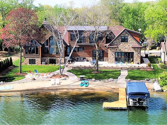 Welcome to Paradise on Lake Shangrila - Where Luxury Meets Lifestyle. Tucked away in one of Southeast Wisconsin's best-kept secrets, this extraordinary waterfront retreat offers a rare blend of high-end design, total privacy, and unbeatable recreational amenities - just a short drive from Chicago or Milwaukee. As featured in Jockey Corp's 2022 model shoot, every inch of this home was designed to impress. With no HOA restrictions or deed limitations, this property is also a dream for short-term rental investors - offering a massive income opportunity in a location where luxury vacation demand is growing fast. From the moment you arrive, you're greeted by an eye-catching exterior of low-maintenance Montana fiber-concrete logs and hand-selected Nashville stone, setting the tone for the craftsmanship throughout. 120 feet of manicured sandy beachfront, swaying lifelike palm trees, a 10-person firepit, and curated outdoor lighting create the feel of a private resort. Expansive patios and walkways seamlessly connect the home to its stunning natural setting. Inside, the Aspen-style interior is bathed in sunlight thanks to floor-to-ceiling south-facing windows and an open A-frame great room with lighted ceiling beams. Wide-plank ceramic wood-look flooring flows across each level. The chef's kitchen is a showstopper - complete with a bold cabinet design, 12-foot quartz island, Sub-Zero refrigerator, and designer appliances. Whether you're entertaining guests or escaping the city grind, you'll find everything you need: a luxurious primary suite with a spa-inspired steam shower, a private fitness room, a state-of-the-art golf simulator/theatre, and an oversized heated garage with pass-through doors for seamless airflow and party-ready access to the epic indoor/outdoor bar with floor-to-ceiling sliding glass doors. This is more than a lake home - it's a lifestyle investment with luxury income potential. Don't miss your chance to own one of the most iconic homes on Lake Shangrila.