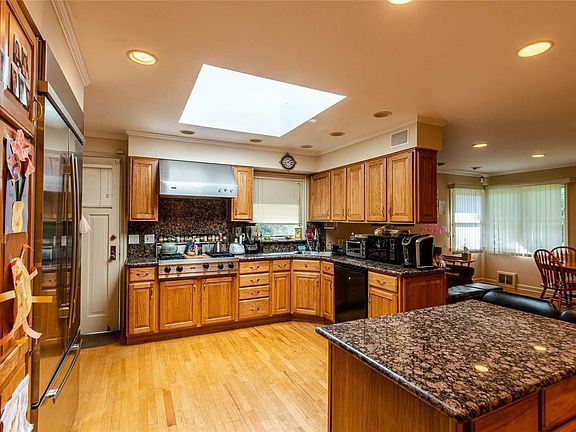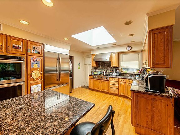 Beautiful and bright, spacious 5 bedroom brick expanded cape in the Weeks Woodland area of Bayside. Situated on a serene park-like setting; 100 x 122 lot on picturesque property! This updated and renovated home features large bedrooms, wood burning fireplace entertainers living room; formal dining room with wainscot; huge gourmet eat in kitchen with granite island which leads into great room overlooking Crocheron park. Sun drenched den or office space. Easy access to LIRR, buses, parkways.