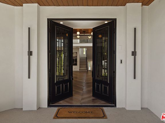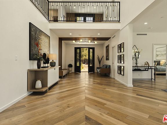 From the incredible herringbone wood floors as you walk into the stunning floor-to-ceiling slabs of Kuroca porcelain in the primary bathroom, every detail of this home has been meticulously planned for the epitome of contemporary Hollywood living. Leaded glass double doors open to the grand main floor, featuring a soaring 2-story entryway that leads to the floor above. The living room and adjoining balcony capture dramatic jetliner views of DTLA, the luxurious hillside, and iconic Hollywood landmarks. The chef's kitchen is a true masterpiece, with gorgeous marble porcelain covering the waterfall center island, countertops, and backsplash, complemented by high-end Fisher and Paykel stainless-steel appliances and custom-made wood cabinetry. An en-suite guest bedroom, powder room, foyer, and laundry area complete the main floor. Upstairs, the private quarters include three en-suite bedrooms, each with dual vanities, glass-enclosed showers with floor-to-ceiling porcelain slabs, and standalone tubs. The game room, family room, and office are located one level below the main floor, where a wet bar rivals the luxurious offerings of Hollywood's high-end nightlife, making it an ideal space for entertaining. The lower floor also includes a home theater, yoga room, sauna, and full bath. The viewing deck and secret wine cellar offer exceptional opportunities for relaxation and indulgence.
