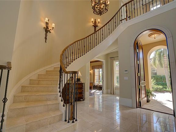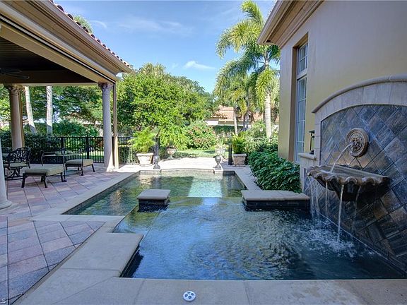 Tucked away privacy awaits in this 4 bedroom 4 1/2 bath villa. First floor master suite encompasses two large custom closets and additional generous first floor guest suite. Dramatic staircase overlooks cast stone fireplace and an 18ft window looking out to a tropical park like setting, stream and bridge. Sliding pocket doors open up from the family room to a lovely covered lanai, retractable screens, pool and spa, perfect for grilling or watching the sunset over the lake with family and friends. Three new air conditioners and tankless hot water heater were just recently added to the home.