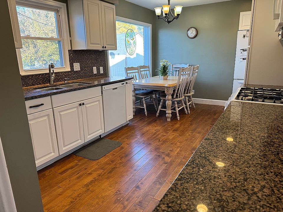 Inside you will find elegant hardwood flooring throughout with a freshly updated kitchen and bathrooms.
