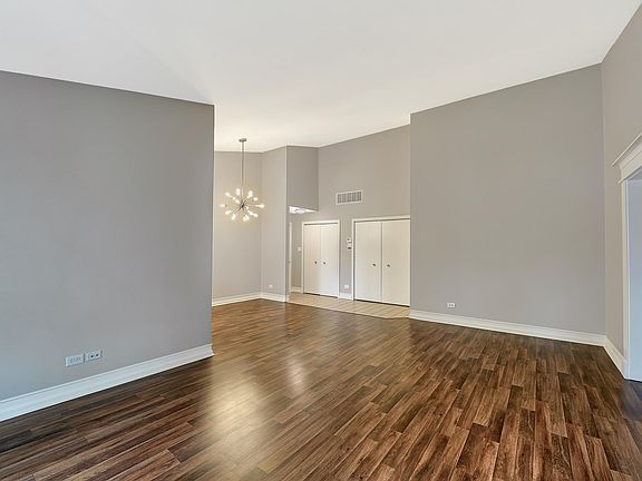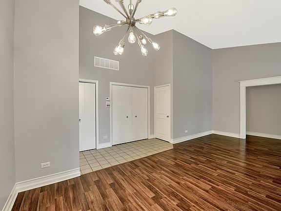 Spacious, airy 2 BR 2BA condo with in-unit washer & dryer, central AC & heat, wood laminate flooring, off-street parking (2 spaces). Three-minute walk to Metra train. Newly decorated corner unit with updated finishes. Has vaulted ceilings and walk-in closets. French doors open onto balcony with treetop views in this third-floor walk-up. Short walk to Homewood's downtown restaurants and shops. $1,500 per month. $3,000 due upon lease-signing, covering 1st month's rent, plus deposit. Tenant pays gas and electric.