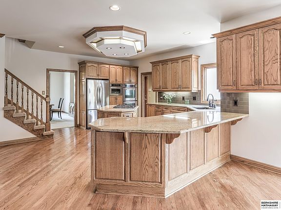 Skyline Woods treasure with almost 6,000 finished square feet and a 1/3 acre lot with the most breathtaking views & landscaping! This 1.5 story home features vaulted ceilings, custom cabinetry & many lovely spaces w/ tons of natural light throughout the entire main floor including a formal dining room, private office w/ backyard views, great room w/ huge windows, and the kitchen w/ brick fireplace. The primary bedroom is also conveniently located on the main floor and boasts an oversized bathroom w/ gorgeous tile, tub, & shower. Upstairs are 3 additional bedrooms and 2 bathrooms plus extra closet storage. The walk-out finished basement is super spacious with a great room area, kitchen w/ full-sized fridge, storage spaces & more. Surrounding the home are mature trees & landscaping and the home backs to a beautiful walking trail. All this space, a private and beautiful lot, plus Elkhorn South schools!