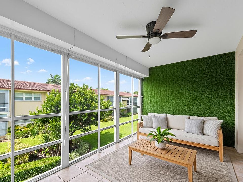 TURNKEY, bright and quiet, second floor, CORNER unit with garden view and natural light throughout. RENOVATED, modern kitchen with breakfast counter, custom cabinetry, quartz countertops, and stainless steel appliances. Spacious living and dining area with sliding glass doors that open to a large screened-in PATIO BALCONY.UPGRADES include complete IMPACT windows, impact front door with touch code lock, NEW central A/C with Google Nest thermostat, NEW water heater and line set, NEW electric panel, LED recessed lighting, NEW ceiling fans, and recently serviced Rolladen shutters provide patio storm protection without the hassle.Community amenities include 2 pools and grilling areas. Common areas are beautifully landscaped. 1 assigned parking space for the unit and guest parking. FURNITURE NEGOTIABLE