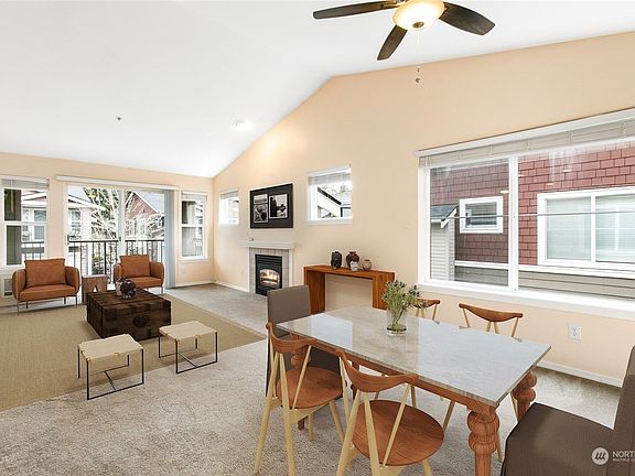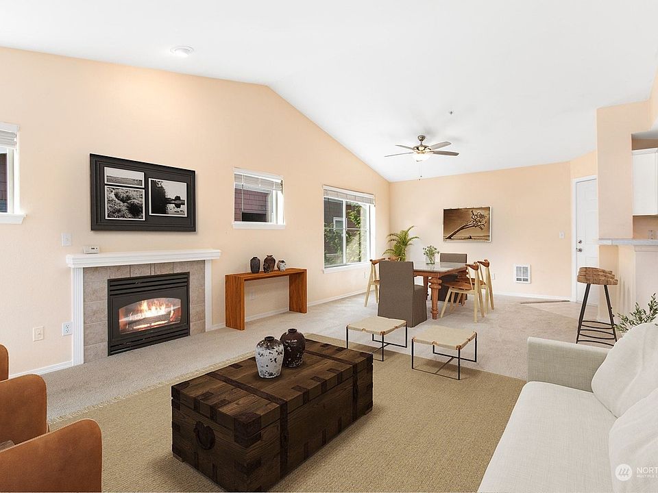 Welcome to this lovely corner-unit walk-up boasting vaulted ceilings, ample natural light, and a private balcony off the living room... providing a sense of space and charm! The open concept floorplan features a cozy fireplace and a kitchen with plenty of storage plus a breakfast bar. The bedrooms are spacious, including the primary suite with private 3-piece bath and walk-in closet. Don't miss the garage with extra storage space! Great community, a short distance to schools, parks and trails. Just minutes to the freeway and JBLM.