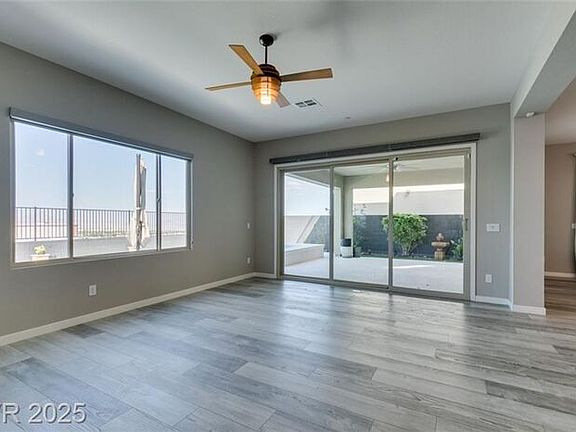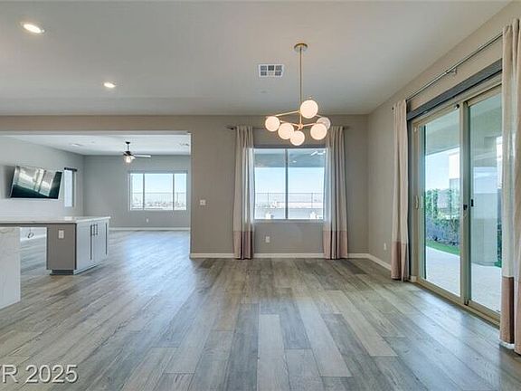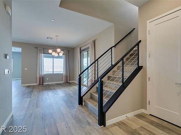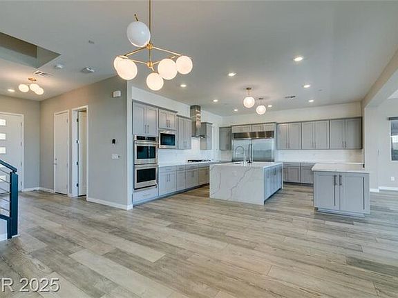 Indulge in refined contemporary living in this thoughtfully crafted home, where sophisticated design and effortless hosting come together beautifully. The open-concept first floor creates an inviting atmosphere for memorable gatherings, enhanced by sleek tile plank flooring and a chef-inspired kitchen showcasing two expansive quartz islands, a striking tile backsplash, and high-end stainless-steel appliances that make entertaining a pleasure. Four generously sized bedrooms and a spacious loft provide comfort and versatility, while the downstairs ensuite bedroom offers an ideal retreat for guests or multi-gen living. The luxurious primary suite elevates your daily escape with a private balcony framing magnificent views of the Las Vegas Strip, city skyline, and surrounding mountains. Outside, a resort-style pool and spa create the perfect backdrop for relaxing or hosting under the open sky, completing this exceptional home.
