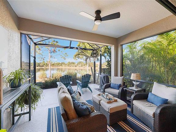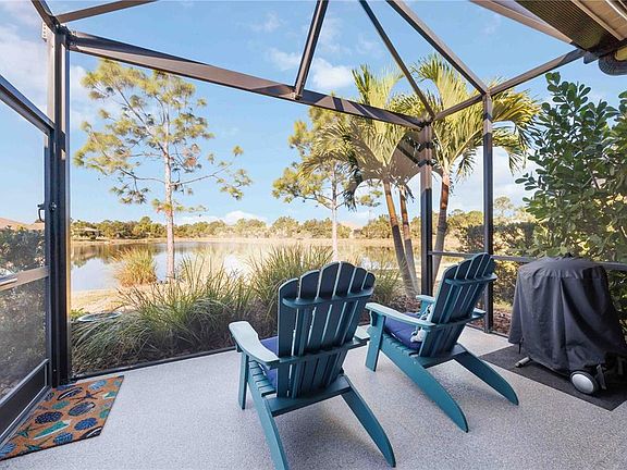 Welcome home to this beautifully maintained Tidewater Villa featuring 2 bedrooms, 2 baths, and a spacious den/office that can easily function as a third bedroom, located in the highly sought-after community of Grand Palm in Venice. Set on a serene waterfront lot, this residence offers west-facing sunset views from the extended screened lanai, complete with an epoxy-finished floor, picture-window screen cage for unobstructed lake vistas, lush tropical landscaping, and an SPF electric sunshade for added comfort and privacy. A retractable front door screen adds extra convenience and airflow. Inside, you'll appreciate the thoughtful upgrades throughout, including tile flooring in both bedrooms, luxury vinyl plank flooring in the den, coffered ceilings and crown molding in the living room, and custom lighting and fans. The kitchen boasts 42” cabinetry, a country-style sink, natural gas stove, tile backsplash, under-cabinet lighting, and a new garbage disposal. Smart-home features include a smart thermostat and Ring doorbell for added efficiency and security. The primary suite includes dual sinks and a walk-in shower, while the laundry room offers upper cabinets and shelving—and the washer and dryer are included in the sale. Additional conveniences include included window treatments, accordion hurricane shutters, whole-home surge protection, and a garage with elevated storage shelving. Best of all, this property is not in a flood zone, providing peace of mind. Residents of this Tidewater Villa neighborhood enjoy their own private pool and spa just steps away, in addition to the three other community pools in Grand Palm. HOA fees include lawn and landscape care, extensive recreational amenities, and a full calendar of social events. Grand Palm is renowned for its active lifestyle and natural beauty, offering a full-time activities director, state-of-the-art fitness center, pickleball, tennis, bocce, basketball, volleyball, dog parks, fishing piers, and miles of walking and biking trails, plus The Social Club and Exploration Park—all accessible by golf cart. Conveniently located near Downtown Wellen Park and the Atlanta Braves Spring Training facility, you’ll enjoy easy access to dining, shopping, entertainment, festivals, and community events. This Tidewater Villa combines comfort, convenience, and resort-style living in one of Venice’s most desirable neighborhoods.
