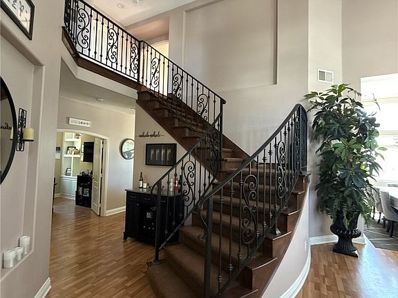 Spectacular views from this beautiful former model home on a cul-de-sac. Large backyard with a pool and spa. As you enter through the gated stamped concrete courtyard into your new home, you are greeted by high ceilings, an elegant wrought iron staircase, a formal living and formal dining room with crown molding, The spacious kitchen opens to the family room and features granite counters w/ full granite backsplash, breakfast bar, white cabinets, double oven, dishwasher and a gas cooktop. The family room opens to the backyard and includes a fireplace, celling fan and built in entertainment center. There are two bedrooms downstairs plus a downstairs bathroom with a shower and upgraded countertop. The second bedroom is an office. Amazing views from the large backyard featuring a newer pool and spa, vast grass area and large covered patio with a tile roof and stamped concrete flooring. Fantastic for entertaining. Upstairs is the grand primary suite with incredible views of the surrounding mountains, hills and canyons. the primary bathroom features dual sinks, a separate shower and tub, and a walk in closet. The other upstairs bedrooms have lighted ceiling fans and share a Jack and Jill bathroom with double sinks and a bathtub, other upgrades include arched doorways throughout, large baseboards, storage shelves in the garage, and an indoor laundry room. So much more to see !