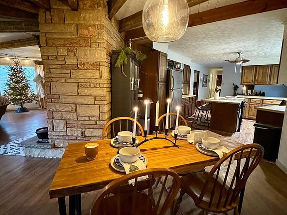 UNIQUENESS OVERLOAD-------------2163 Bomont Rd., Bomont, WV - This remarkable country listing boasts a unique blend of charm and character, situated on 19.5 acres of land (recently surveyed), less than 10 miles from I-79 and only 30 minutes to Charleston. The home's distinctive features include a rotunda-style open concept living, dining, and kitchen area. This inviting circular space showcases stunning exposed wood ceiling beams and a striking floor-to-ceiling stone fireplace with a functional wood-burning stove. The living area is spacious and bright, with insulated large windows offering abundant natural light. This vinyl-sided ranch home includes 2,300 sq ft of living space, all on one floor, and offers 3 bedrooms and 2 full baths. The land will continue to impress any buyer with its hiking and ATV trails, and accessible wooded acreage, easy to explore. Beautiful side yard ideal for gardening or children's play. Extensive natural stone retaining walls and terraced landscaping create both beauty and function across the property. Notable bonuses include city water, central heating and cooling, jetted garden tub, kitchen island, covered patio, rear deck, free gas rights (wells not currently producing per owner), mini waterfall on property, and paved road access. $299,000
