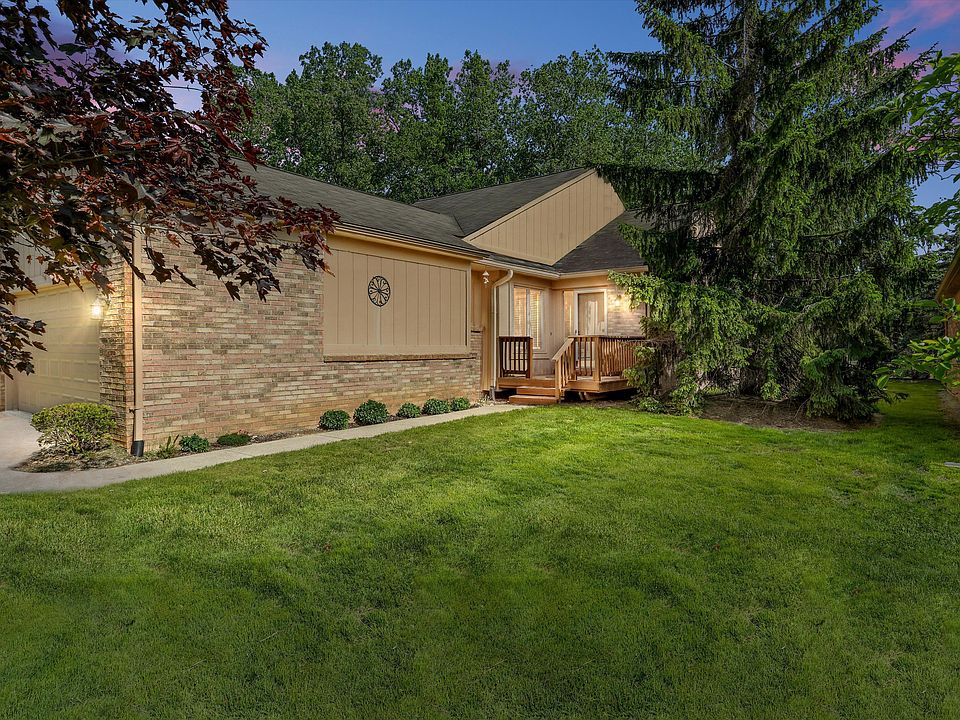 Immaculate detached ranch condo in the heart of desirable River Pines. This condo is light and bright with vaulted ceilings, neutral decor throughout, and many upgrades. New birch tone flooring in the laundry, kitchen and foyer. Bright white kitchen with granite, stainless, an island and breakfast nook. The living/dining space leads to a lovely deck with brand new remote controlled retractable awning. Generous primary bedroom with large windows overlooking wooded area, walk in closet and en suite bath with large granite vanity, jetted tub and shower. Secondary bed ideal for office or guest space. First floor laundry. Attached 2 car garage. Furnace/AC approx 5 years old. Unfinished basement with workshop space. This unit is truly a must see!***All offers due Sunday June 4 by 5pm***