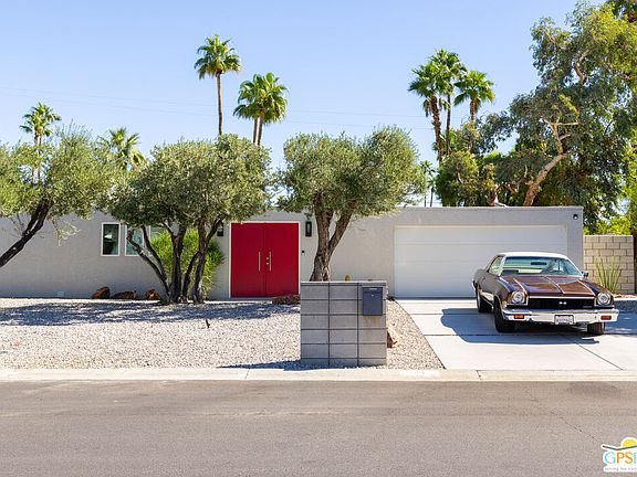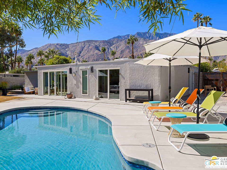 Discover a breathtaking reimagining of an iconic ALEXANDER home, meticulously crafted by the legendary Alexander Company in 1959. Nestled in a serene cul-de-sac, this architectural gem, designed by the esteemed Palmer & Krisel, epitomizes the timeless elegance of the flat-roof model. Located within the prestigious Racquet Club Estates, this home seamlessly blends mid-century charm with cutting-edge modern upgrades, creating a luxurious retreat that captivates at every turn. Step through the vibrant red double doors into an expansive great room, where walls of glass frame stunning views of the resort-style backyard. The open-concept living space is a masterpiece of design, featuring a state-of-the-art kitchen with sleek cabinetry, premium appliances, and a striking L-shaped island perfect for entertaining. The home's 24x24 tile floors flow effortlessly, uniting classic style with contemporary sophistication. With a breathtaking view of the San Jacinto mountains, the outdoor oasis is nothing short of extraordinary. The newly resurfaced pool, complete with custom trim tile and a double drain for enhanced safety, is paired with a new, luxurious in-ground spa, both controlled by a cutting-edge app-enabled remote heater for ultimate convenience. The mature trees complement the lush, newly designed landscaping, enhanced by upgraded irrigation and ambient landscape lighting, creating a private paradise perfect for both intimate gatherings and grand celebrations. A natural gas-converted BBQ elevates outdoor entertaining to new heights. Inside, no detail has been overlooked. Enjoy the elegance of new dining room sconces, updated entryway lighting, and custom blinds adorning every window and door. Smart home features include a Ring alarm system and dimmable lighting throughout for added functionality. This is more than a home; it's a lifestyle. With its unparalleled blend of mid-century heritage and modern luxury, this Racquet Club Estates treasure is ready to welcome its next owner. Don't miss the opportunity to own a piece of architectural history, elevated to perfection. See the floorplan and full list of seller upgrades for the complete picture of this extraordinary property.