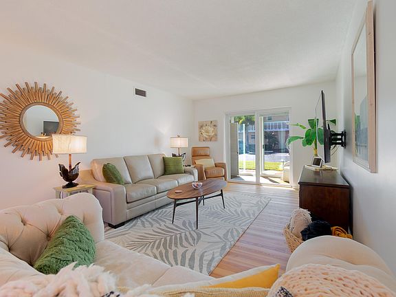 Lovely updated first floor condo with impact glass doors and windows! One bedroom, 1.5 bathrooms plus sunny Florida Room porch with full impact sliders that open up to the rear patio. Murphy Bed makes an inviting place for guests to stay. Laminate and tile floors make it easy to clean. Central Air in unit, combo washer/dryer unit in closet on Porch. Short walk to pool & amenities. Village Royale is a popular 55+ community that is only 3.5 miles to the Public Beach. Tri-Rail passenger train is .9 mi away and lots of restaurants and shopping opportunities are within 1 mile of the condo. Easy access to I-95 for commuters. Showings start Sunday 11/23.