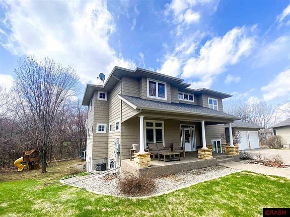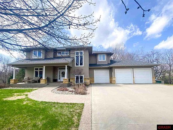 Introducing 2164 Red Tail Lane, Upper North Mankato! This fantastic 2-story is located in a cul de sac on a ravine lot with everything you're looking for. The 2-story foyer opens up with a formal office to your left and a sweeping staircase to your right. The formal living room features a gas fireplace with stone detailing, recessed lighting, and makes a great place to spend the evening. The dining room and kitchen are extremely spacious with gorgeous Andersen windows allowing in views from the treed lot. The dining room leads out to a wonderful deck that was redone in 2019. Beautiful cabinetry is featured throughout the home, along with stainless steel appliances, large center island and pantry. The laundry room is a dream with tons of space & storage! The 3-stall garage is insulated and features an EV charger. Upstairs are 4 large bedrooms, all with great closets! The primary bedroom has a large L-shaped walk-in closet. The en-suite bath features dual vanity, large soaker tub and separate shower. There is also a lofted area with built-in desk. Downstairs, is an entertainer's dream with beautiful wet bar with stainless armoire fridge, wine fridge, custom-built cherry cabinetry and 9' of granite. The family room is large enough to feature game tables, has another lovely gas fireplace and walks out to the backyard via exposed aggregate patio. There is a home gym, 5th bedroom, full bath and lots of great storage downstairs. Other features to this home include a new roof in 2021, poured concrete foundation, security system, in-home audio, storage shed, and darling front porch. Call now for a private viewing of this home!