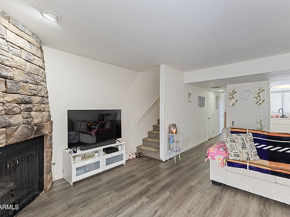 You'll love this well-kept townhome just off Gilbert Rd & University! Featuring beautiful laminate wood floors, a cozy stone-accented fireplace, and a bright kitchen with white cabinets, neutral countertops, and new white appliances for a clean, modern feel.
