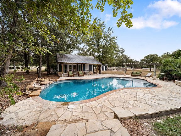 Just five minutes from Round Top, this property feels like a private compound, ideal for family getaways or hosting friends. The main home offers a vaulted, light-filled living room, open kitchen and dining area, four bedrooms, and three full baths. A guest house adds flexibility for visitors. Outdoors, enjoy a sparkling pool with pool house, seperate fire pit area for evenings, and a stocked pond with bass and catfish, complete with piers for fishing or relaxing. Set on 8.7 wooded acres, the property already generates income during Antique Shows and offers strong potential for more. Listing agent owns HOSTIE Vacation Rentals and can provide guidance on maximizing income opportunities.