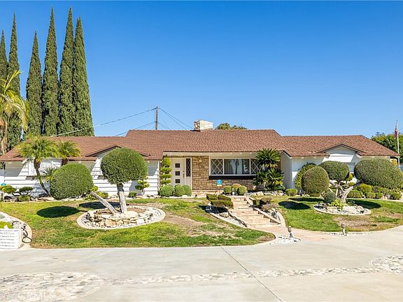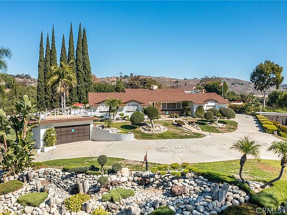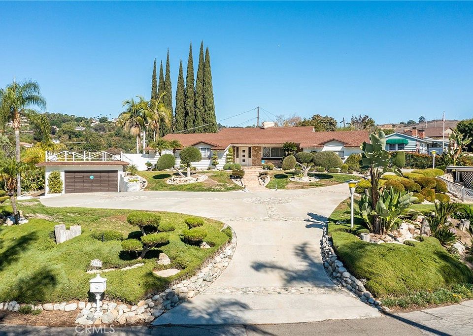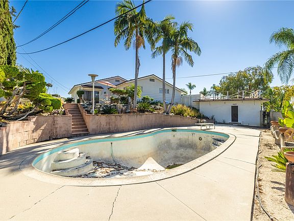 SPRAWLING SINGLE STORY POOL HOME ON AN ELEVATED VIEW LOT. Set on a sweeping corner lot, this great piece of property offers a variety of front landscaping with a concrete/river rock driveway that splits to two sections, a detached two car garage with an approximately 500' view deck on top, a detached workshop, and stone steps that lead up to the covered front porch. The front of the home is finished with wood siding, stacked stone, and a vintage front door with windows. The front door leads to an open floor plan, starting at the entryway offering original hardwood flooring in great shape and to the living and family rooms. The living room offers carpeted floors, a spanning front view window, a wide painted brick fireplace with hearth, and an adjacent bonus room. The bonus room is the original three car garage, approximately 525', offering a sliding door to the backyard, wainscoting, and paneled ceiling with exposed beams. The family room features vaulted/exposed beam ceilings, a brick fireplace, a sliding door to the backyard, and versailles patterned floors. The kitchen offers tiled floors, tiled counters with countertop seating, solid wood cabinetry, a professional series gas range, and a pantry area with a refrigerator. An attached laundry room with cabinetry is just beyond the pantry and offers direct access to the backyard. Down the hallway you will find three spacious bedrooms all with carpeted flooring and windows that let in plenty of natural lighting. There are two bathrooms, one with a separate shower and tub, one with a shower/tub combo, both are fully custom tiled. The backyard features an in ground pool that is currently empty (with a financed offer that requires the pool to be operational, that could be done prior to closing). There is a spacious patio area with stone decking, lots of mature and manicured landscaping, multiple planter areas, a grass lawn, and more. Finally, there is a small covered barn with a corral on the lower tier of the property. This unique lot and is a rare find with the opportunity to do some cosmetic upgrades and make this your own, it is a true gem. An unpermitted 580 square feet is added to the original size, this includes the original garage which is now the bonus room and the attached laundry room that was previously a covered porch.