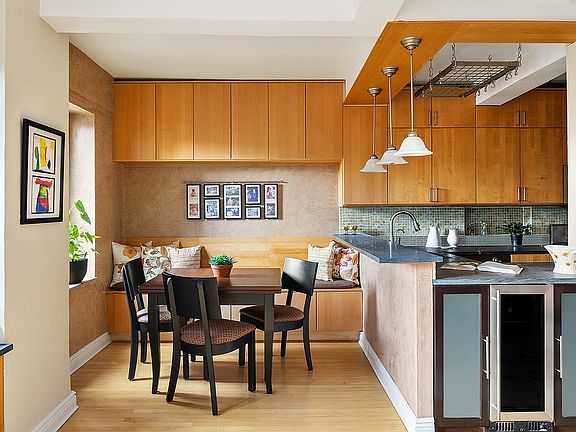 The open kitchen, L-shaped living room, and windowed dining alcove with built-in banquette flow seamlessly, connecting the home's entertaining spaces. The U-shaped kitchen is beautifully appointed with stainless-steel appliances, including an oversized gas range, in-sink waste disposal, wine refrigerator, stone countertops, an elevated breakfast bar, and a full pantry closet. Rich wood cabinetry extends to the ceiling and continues beyond the kitchen, with matching custom built-ins throughout the dining alcove and living spaces.