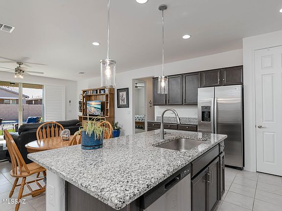 What a Find! This meticulously maintained newer build home is bright and open; with split bedrooms and Great Room floorplan. Kitchen is open to dining and living rooms with gorgeous Espresso cabinetry, granite counters, huge Kitchen Island, SS appliances and convenient lower pull-outs! Spacious Primary suite offers Walk-In Shower and Large Walk-In Closet. Custom wood Plantation Shutters throughout the home! Fridge and W/D Included! Large, private corner lot with low care turf and decorative rock is great for entertaining or just relaxing and taking in the AZ sunsets from the covered patio. Enjoy living in the Red Rock community with pools, parks and lots of additional Community amenities! Close to I-10, With easy access to Marana and Tucson!