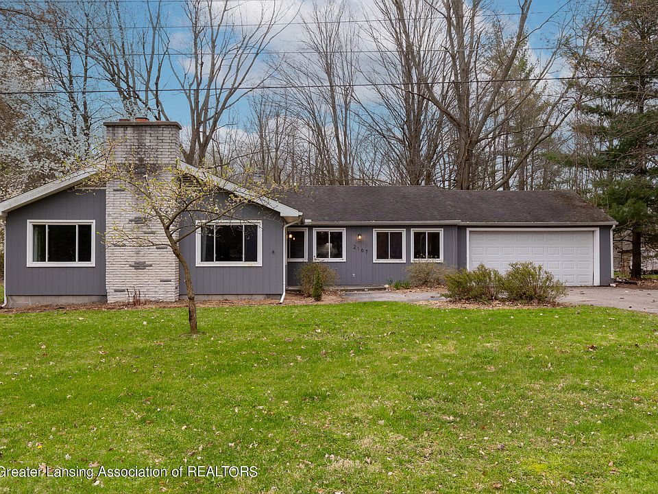 Welcome to 2167 Raby Rd East Lansing, MI 48823! This 3 bedroom, 1 full bathroom ranch style home rests on a lot of .947 in Meridian Township and Haslett School District. The spacious living room is warm and inviting, centered by a wood burning fireplace and many windows. Enjoy the eat in kitchen with breakfast bar, first floor laundry, and office. The spacious primary bedroom features a sliding glass door out the deck and patio area overlooking the beautiful, private backyard. Updates to the home include a fresh coat of paint and new water heater in 2021.