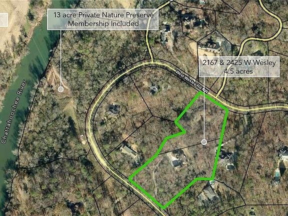 It is hard to imagine a more warm, inviting home than this hilltop gem in the Paces neighborhood. The forested lot creates a secluded oasis for your family. This sale includes two lots of record: 2167 W Wesley (2.44 acres) with the home and an adjacent parcel at 2425 W Wesley (2.07 acres). The total acreage includes 4.51 acres and you may choose to keep this expansive property to yourself, or the option exists to sell/build a separate home at 2425 W Wesley if desired. These spectacular private lots are located at the “end” of West Wesley, one of the most serene locations in all of Buckhead. Level backyard lawn and lovely seasonal gardens. A screened living and dining area with a wood burning fireplace enhance the indoor/outdoor lifestyle. Room to add a pool! MAIN - Superb craftsmanship and natural wood accents are found throughout. Through an arched front door off the main foyer is a cozy gentleman's study lined with warm Pecky Cypress paneling and arched French doors to the front yard. The show-stopping great room features a dramatic vaulted wood ceiling and one of 5 fireplaces! Access dining, kitchen, keeping room, screened porch & primary bedroom along a long hallway lined with graceful arches. The lovely light-filled kitchen is full of character and charm with custom white cabinets, matte black stone counters, massive island, generous walk-in pantry, and a light-drenched breakfast area. A really beautiful stone 2-sided fireplace has a Scandanavian brick firebox for excellent heat distribution in the kitchen and keeping room. The comfortable keeping room flows into a generous screened porch with living and dining space that takes full advantage of the wooded views. Enjoy this fireside indoor-outdoor space year 'round. Keep things tidy & organized with a large mudroom off the 3-car garage, a home management office, spacious walk in pantry, laundry room and even extra storage for seasonal items and small appliances. A rear staircase to access the upstairs rec room and bedroom/bath above the garage wing is located here. Primary Bedroom - The MAIN LEVEL primary bedroom suite occupies its own wing! The large yet warm bedroom has a cozy fireside sitting area, and access to a private patio. The bath has separate walk-in closets, separate vanities, separate water closets, and a double shower. UPPER - At the top of the main stairs is a huge game room plus a home theater. One of the 4 spacious upstairs bedrooms is a second primary bedroom with a massive walk in closet and bath. The upper level of the garage wing features a 2nd HUGE bonus room. 2nd laundry room, and generous closets and so much storage throughout - literally everywhere! As you can see, this home is very special both inside and out - the perfect secluded retreat while close to all that Buckhead and Vinings has to offer! Also included is ownership in the 13-acre riverfront nature preserve across the street. You and your family will have many opportunities to enjoy and explore nature, yet its only minutes from the premier private schools and the best that Buckhead and Vinings have to offer!