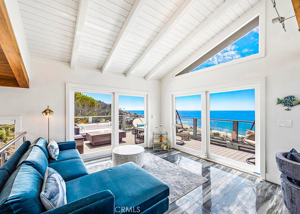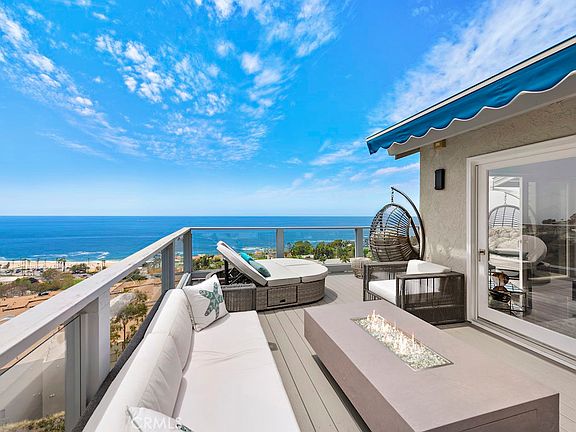 Experience panoramic, unobstructed whitewater ocean views from this stunning residence located in the sought-after gated Aliso Laguna community. Recently remodeled with impeccable taste and attention to detail, this home captures breathtaking panoramas of the Pacific, Catalina Island, city lights, and renowned Laguna Beach coastline that impress from nearly every room. The enviable corner location provides total privacy, an excess of natural light, and an expansive wraparound deck off the main floor to entertain al fresco while enjoying the view. The airy and open two level design is complemented by soaring beamed ceilings, picture and clerestory windows, and skylights that are found throughout the home. The upper level hosts a gourmet chef's kitchen with commercial grade appliances and sleek cabinetry, a dining room with contemporary fireplace and climate controlled, top of the line wine cellar, and a living room that opens on two sides to the ocean view deck. Wake up to the sound of waves crashing from the three bedrooms located on the lower level, including the primary suite boasting a spa-like bath with heated floors, dual sinks, soaking tub, and steam shower. Other recent upgrades include updated electrical and plumbing (pex), newer AC split system (2019), reverse osmosis system, tankless water heater, and more. Located just a stones throw to the sand and famed Montage resort, this home does not disappoint.