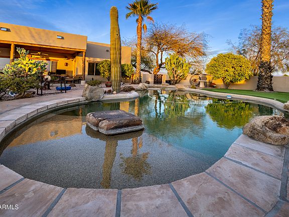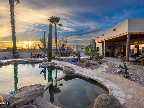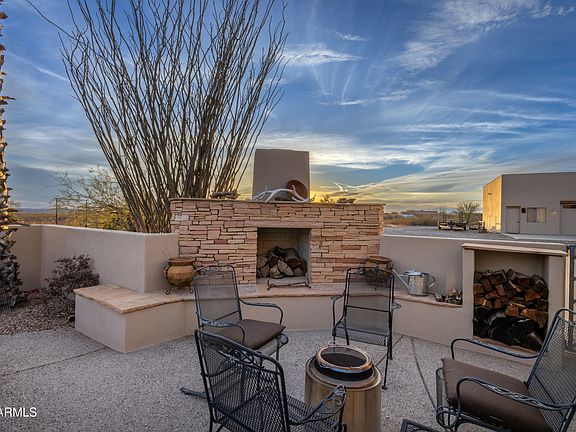 Exquisite 3,200 sq ft estate blending cowboy rustic charm with modern luxury. Set on a private 7-acre corner lot (two 3.5-acre parcels) in the prestigious Vista Royale subdivision, this home offers unmatched privacy, sweeping panoramic views, and an authentic Arizona lifestyle. Horse enthusiasts will love the Mare Motel with 5 stalls, hay storage, a spacious foaling stall, extensive 4-rail pipe fencing, and an arena with expansion potential. Inside, enjoy rustic wood vigas, a dramatic flagstone gas fireplace, and lighted art niches that create a warm, inviting atmosphere. The home features solid wood doors and custom cabinetry throughout, underscoring craftsmanship and attention to detail. In addition to the attached two-car garage, there is a detached garage spanning over 1,800 sq ft with an RV bayplenty of room for toys and projects. The backyard oasis offers an outdoor kitchen, a large covered patio, and a heated pool/spa with majestic views of Vulture Peak. This property is an entertainer's paradise in a tranquil subdivision with county-maintained roads, starry nights, and quick access to state land for miles of riding and recreation.
