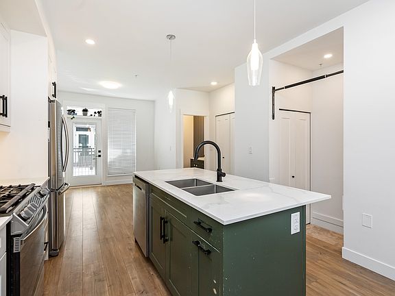 Quartz countersLarge islandSs appliancesGas stoveLovely fireplace feature wall