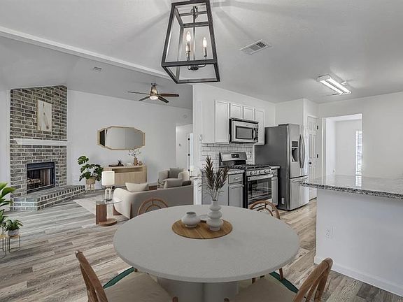 Welcome to this beautifully updated 4-bedroom, 2-bathroom home nestled in a peaceful cul-de-sac. Featuring a stunning gray brick and stone exterior, this home blends classic curb appeal with modern farmhouse touches. Step inside to find brand-new flooring , fresh Sherwin-Williams paint , stylish new doors and hardware, and updated ceiling fans in every room. The spacious kitchen boasts granite countertops, a sleek modern backsplash, and farmhouse-style lighting. The formal dining area features shiplap accent walls—perfect for entertaining. Both bathrooms have been fully remodeled , with the master showcasing updated vanity faucets for a fresh, modern feel.