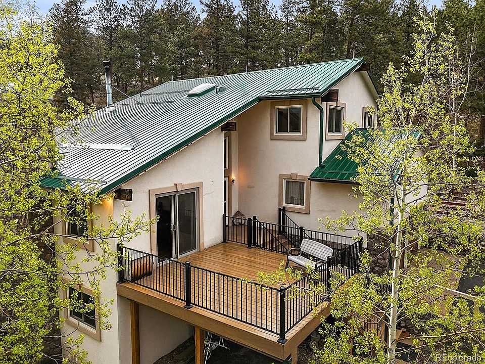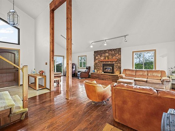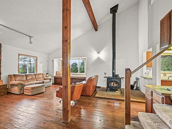 The home's exterior showcases timeless durability, featuring a metal roof and stucco siding. Step outside to enjoy two covered patios and a sunny view deck, perfect for soaking in the breathtaking scenery. The views include distant mountain vistas, with the majestic Pikes Peak gracing the horizon. Inside, the home radiates warmth and charm. The main and upper levels have been freshly painted, and the carpeting has been professionally cleaned, ensuring a move-in-ready experience. Open vaulted ceilings create an airy and spacious ambiance, while two gas fireplaces and a cozy woodstove add inviting touches for cooler evenings.