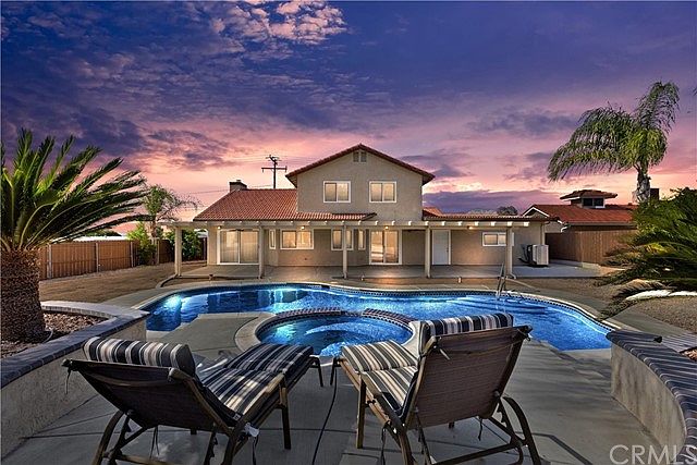 RARE OPPORTUNITY ALERT In the heart of Wildomar where LAND, SPACE, IMPROVEMENTS & ENTERTAINING collide.. BOOM This beautiful 3 bedroom, 2.75 bath with main level office (easily convertible to additional 4th bedroom sits on an incredibly desirable corner HALF acre lot with full access to the rear yard via retractable fence. Upon entering, greeted by a large open living area that flows into dining with an oversized sliding glass door and convenient to the kitchen. The interior offers tasteful and functional upgrades including: all dual pane windows with coverings, newer carpet with thick padding, large neutral tile, 6-inch baseboards, whole house fan with individual receptors for each room, smooth textured high ceilings and recessed lighting. Spacious master suite has a reading nook, beautifully remodeled bath with dual sink white vanity, granite countertops & 4inch backsplash tie-in, porcelain wood textured tile and separate shower/tub. Additional 2 bedrooms are generously sized with large closets & 3 paneled doors. Upstairs bathroom completely remodeled: porcelain wood textured tile, vanity with granite countertop, gorgeous white tiled shower enclosure with mosaic accent band, light fixture and new hardware. The 3-car garage boasts an additional approximate 400 sqft for all things storage, tinkering, collectibles or lounging. Massive AlumaWood solid patio cover sits on an extensive concrete slab for additional low maintenance shade & space to entertain through all seasons. Large in ground pool AND spa is the life of the party all year around with newer pool heater, variable speed pump complete with LED multi-colored lights for after sunset fun. HUGE lot affords endless opportunities to accommodate toys, equipment, gardening, workshop, perhaps even another dwelling/granny flat Additional upgrades: New energy star A/C, Ceiling fans in all bedrooms & living area, Wall mount LiftMaster garage door opener, Fresh exterior paint & rain gutters. The options are yours for the making, begin by calling it your new home NO HOA & incredibly LOW TAXES. This.. THIS home has it all and the space for EVERYTHING.