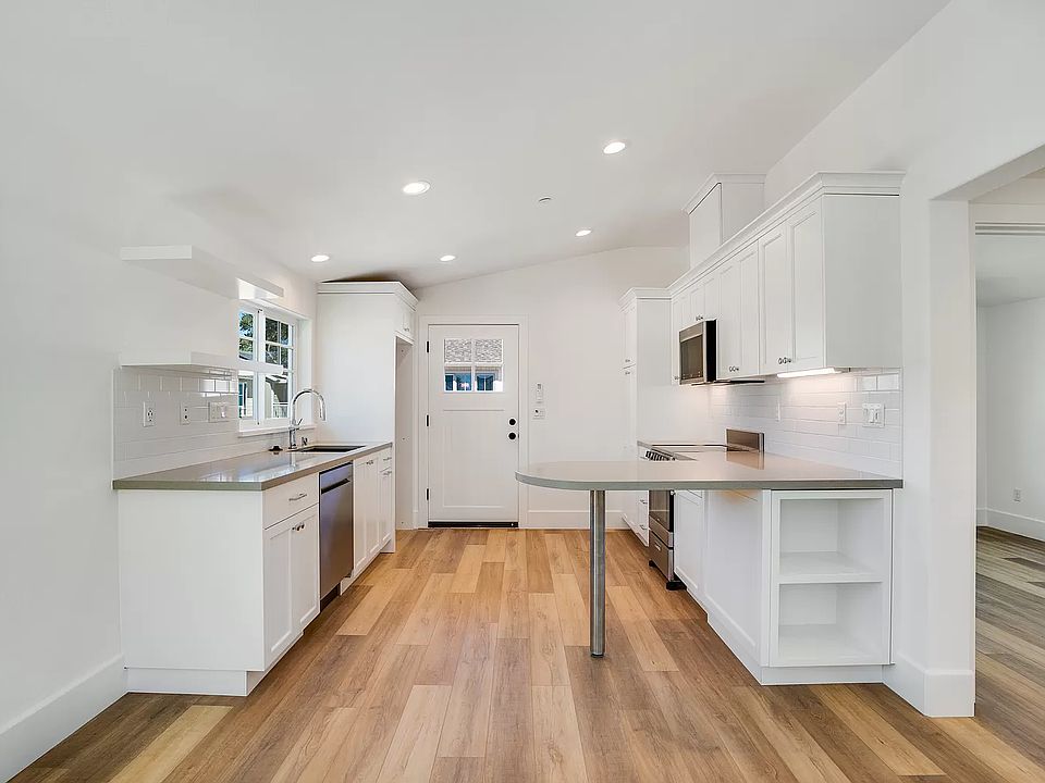* Spacious bathroom, bright kitchen with island. New gorgeous modern kitchen and dining nook with quartz countertops and stainless steel appliances as well as a bright living room.
