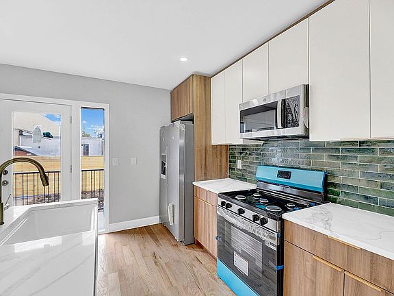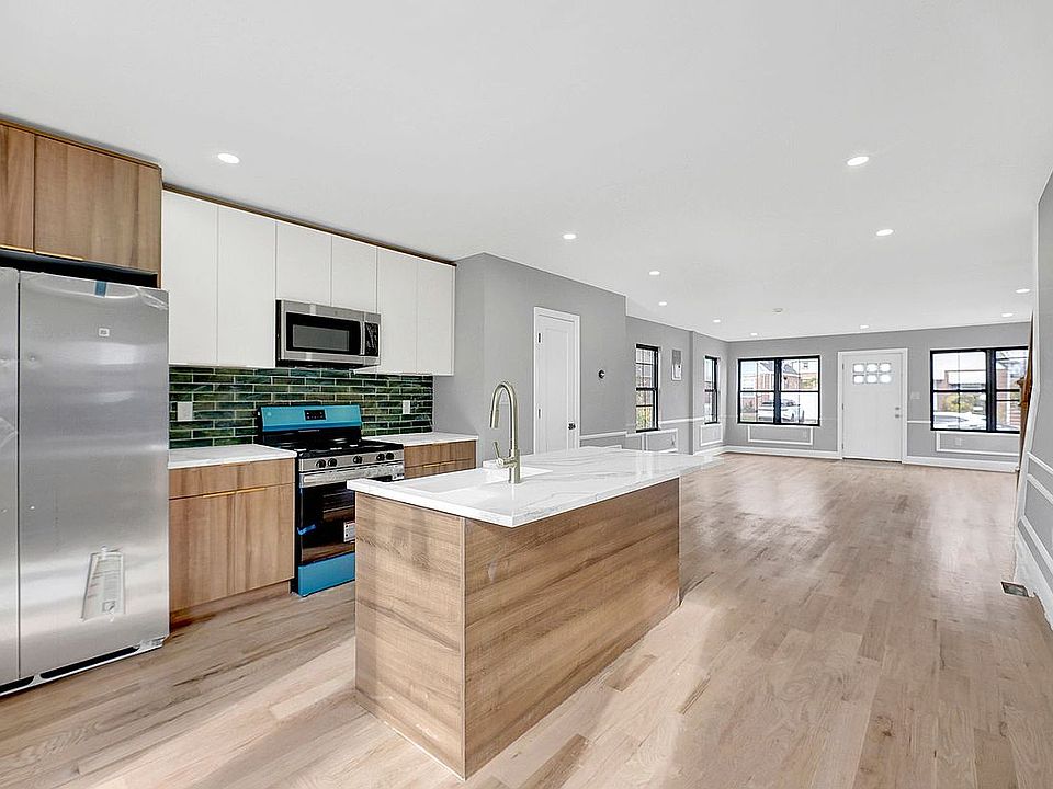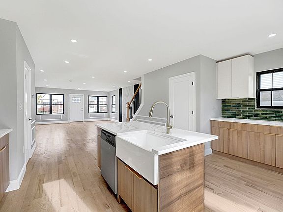 Discover this spectacular luxuriously renovated, turnkey, move in ready massive fully detached single family nestled on a beautiful tree lined street of Springfield Gardens. Sitting on a 40 x 80 lot featuring a wide private driveway and tons of outdoor space to enjoy friends' gatherings. Families looking for space, will appreciate this meticulously renovated single family that will captive you from the moment you arrive with its warm & welcoming energy. Open the door and enter an expansive sun drenched modern open concept living/dining area which provides great space for entertaining. Towards the rear of the house the elegant granite kitchen any chef will love features floor to ceiling custom cabinetry and adorned with a full fleet of stainless-steel appliances. Formal dining area leads into large rear yard. Half a bath first floor for your guest. Up a flight of stairs 3 spacious bedrooms equipped with ample closet space and an additional master suite. Down the hall a fully tiled windowed bathroom awaits you that is equipped with state-of-the-art wall & floor tiles. Up a flight of stairs into the fully finished attic. The high ceiling Full finished basement with interior and EXTERIOR access, Full Bathroom and the spacious room space can easily be used as an extra Bedroom or Family room/media/den, home office, storage space or additional recreational space. This beautiful house has been fully gutted & remodeled by an expert team of contractors and designers featuring select wide oak wood flooring, recessed lighting, updated electrical, HVAC and plumbing systems throughout. Conveniently located with close proximity to major transportation, schools, shopping centers, restaurants, cafes, restaurants, and many other vibrant neighborhood amenities.