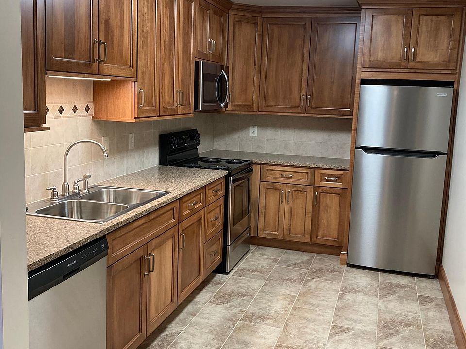 This is a newly renovated apartment. It comes equipped with stainless steel appliances, microwave, ice maker, garbage disposal and under the counter lighting. The kitchen has new custom made cabinets and quartz countertops. Bathrooms have custom vanities with granite tops. New ceramic tile floors in kitchen, dining room and bathrooms. Living room and bedrooms are carpeted. The master bedroom has a large walk-in closet. All applicants must call the number provided to obtain an application. No application fee. Tenant pays electric. Heat is gas and is included in the rent. Garage space includes a storage unit. Only one garage space is included. Other vehicle parking is on outdoor lot. No pets. Tenants are required to purchase renters insurance. Applicants must have good credit standings.