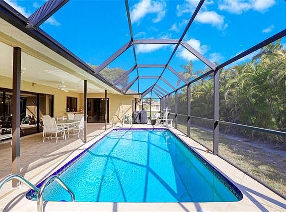 Location! Location! This airy curb appeal inland corner home of 3 Beds ; 2 Baths ; 2173 SF features upscale landscaping with Areca palms offering seclusion and privacy for the well-appointed rear screened lanai with pool, dining and lounging. The scale of the home provides a super roomy primary suite with full bath, jetted tub, walk-in shower, separate vanities and dual closets. 2 generous split bedrooms share a full bath. Full laundry room and 2 car garage with plenty of storage room, completes the home. Great upgrades since 2018 are in place including a new roof, new lanai cage, some impact windows, duct and HVAC work. Close to schools and easy off-island.