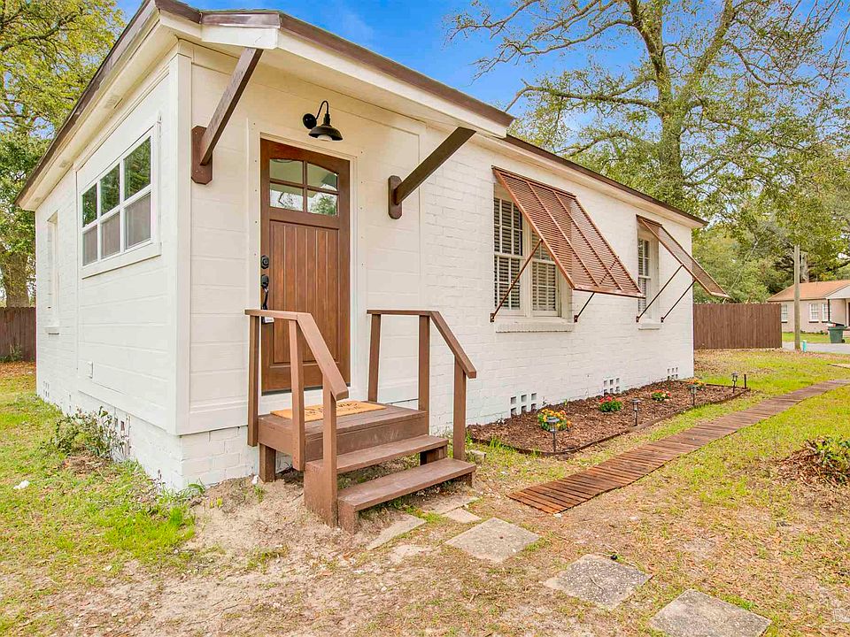 Within the coveted Navy Point neighborhood, this remodeled WWII-era brick-block cottage presents a delightful fusion of vintage allure and contemporary comfort. Stepping through the distinguished mahogany front door, you'll be greeted by a mudroom/laundry room, complete with a shoe cubby and coat hooks. The new kitchen features quartz countertops, a farmhouse sink, and sleek cabinetry. The interior is adorned with fresh paint, new luxury vinyl plank flooring, and new flight fixtures throughout. The HVAC, HVAC ductwork, hot water heater, appliances, and roof were all replaced in 2023, ensuring little to no out of pocket costs for years to come. Benefit from an upgraded 200-amp electrical service and updated electric breaker, providing added safety and reliability. Bahama shutters and custom-made fabric panels, costing $6,000, enhance the home's curb appeal, adding a touch of sophistication and more importantly protection. This home, situated in an area without short-term rental (STR) restrictions, allows for a great investment opportunity with income projections just under $38k per year. Enjoy close proximity to water views and the Naval Base, perfect for those who appreciate the serenity of waterfront living while still being conveniently located near amenities. Navy Point offers a public boat launch, park, waterfront walking trails, kayak launches, paddle boarding and more.