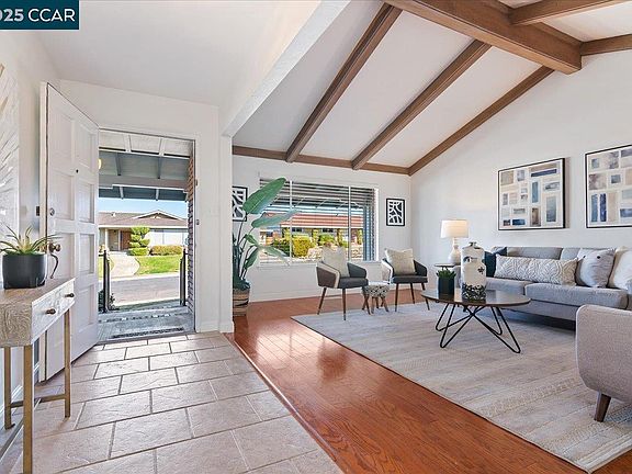 Lovingly maintained by the same family for over forty years, this charming 3-bedroom, 2-bath single-level home features a thoughtful layout and inviting spaces. Upon entry, the formal living room welcomes you with vaulted ceilings and exposed wood beams, creating an airy and spacious feel. The bright and open kitchen offers ample cabinetry and counter space, seamlessly flowing into the dining and family room. The family room features a wet bar and cozy fireplace, creating a warm and inviting gathering space. Sliding doors lead out to the covered patio, providing a shaded retreat for outdoor entertaining, while mature fruit trees add charm and seasonal bounty to the spacious backyard—perfect for relaxing or hosting friends and family. Freshly painted interiors and gorgeous hardwood floors enhance the home’s warm and timeless appeal. The primary suite includes an en-suite bathroom and vanity area, while the additional bedrooms offer flexibility for family, guests, a home office, or creative space. The attached two-car garage provides convenience with laundry and extra storage. Located in an established neighborhood near parks, shopping, and dining, this move-in-ready home is a fantastic opportunity. Don't miss this chance to make it yours!