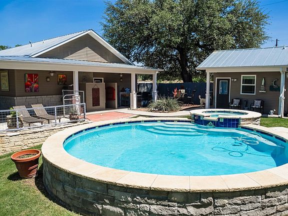 Rare offering located on the San Saba River with appx. 300+- ft of river frontage. This 3 bedroom 2 bath home with an office, offers many extras including a swimming pool & hot tub. The house features a large den dining kitchen combination with granite counter tops in the kitchen & bathrooms. The home has a split bedroom arrangement with a wood burning stove, stained concrete floors, carpet in the bedroom & office. Out back of the house is a large covered porch, green house & garden area. Next to the pool is a pool house with a bathroom & outdoor shower. The property is on city water, city sewer & also has a water well, the yard has a sprinkler system with water provided by the water well. A large metal barn garage shop with a large roll up door with a loft for storage also offers a small roll up door for lawnmowers or golf carts. Attached to the barn is a horse stables with water troughs scattered around the acreage.