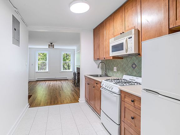 Upon entering, you’re welcomed by abundant natural light, a treetop view, a decorative fireplace, and classic hardwood floors. The kitchen features full-size appliances, Corian countertops, and plenty of space for a dining table, pantry, or buffet.