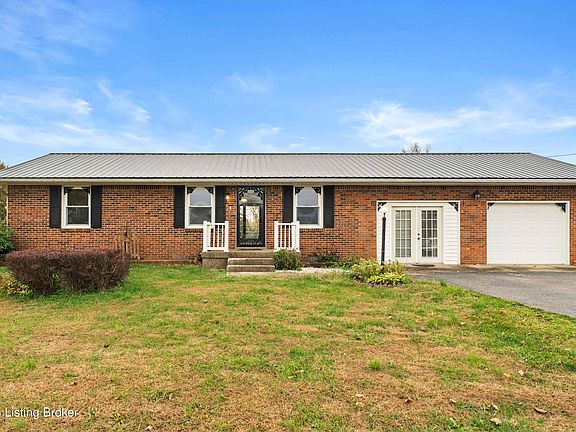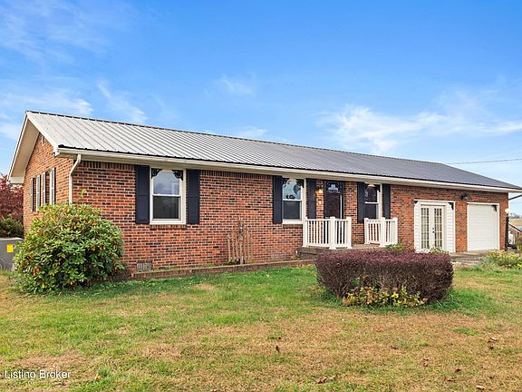 Located along Highway 477 just outside of Irvington, this well-maintained 3-bedroom, 2-bath brick home blends comfort and updates throughout its 1,224 sq ft layout. The black metal roof and full replacement windows offer lasting value, while engineered hardwood flooring and crown molding add warmth and detail to every room. The kitchen features a stainless-steel stove and French-door refrigerator, with convenient flow to the dining area and living room. A cedar-lined hall closet and large front bedroom closet provide extra storage. The hall bath includes a porcelain tile shower floor, freestanding vanity, and modern fixtures. The home is served by by an electric hot water heater and a new HVAC system installed in March 2025. Outdoor features include an aggregate-concrete front porch, concrete back patio with paver area, blacktop driveway, and a shed with a tall roof for additional storage. The small propane tank and no HOA restrictions add convenience and flexibility. Conveniently close to Irvington Elementary School (0.6 mi), Save A Lot grocery (0.8 mi), and approximately 25 minutes to Fort Knoxthis property offers small-town living with easy regional access.